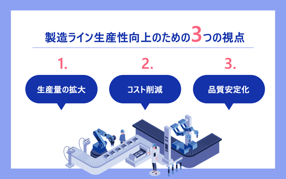労働力の確保が難しい中、製造現場には少ない人的リソースで高い生産性を生み出すことが求められます。そのようななかで、製造ラインの生産性を高めることにはどのようなアプローチがあるのでしょうか。具体的には、以下のようなアプローチが考えられます。