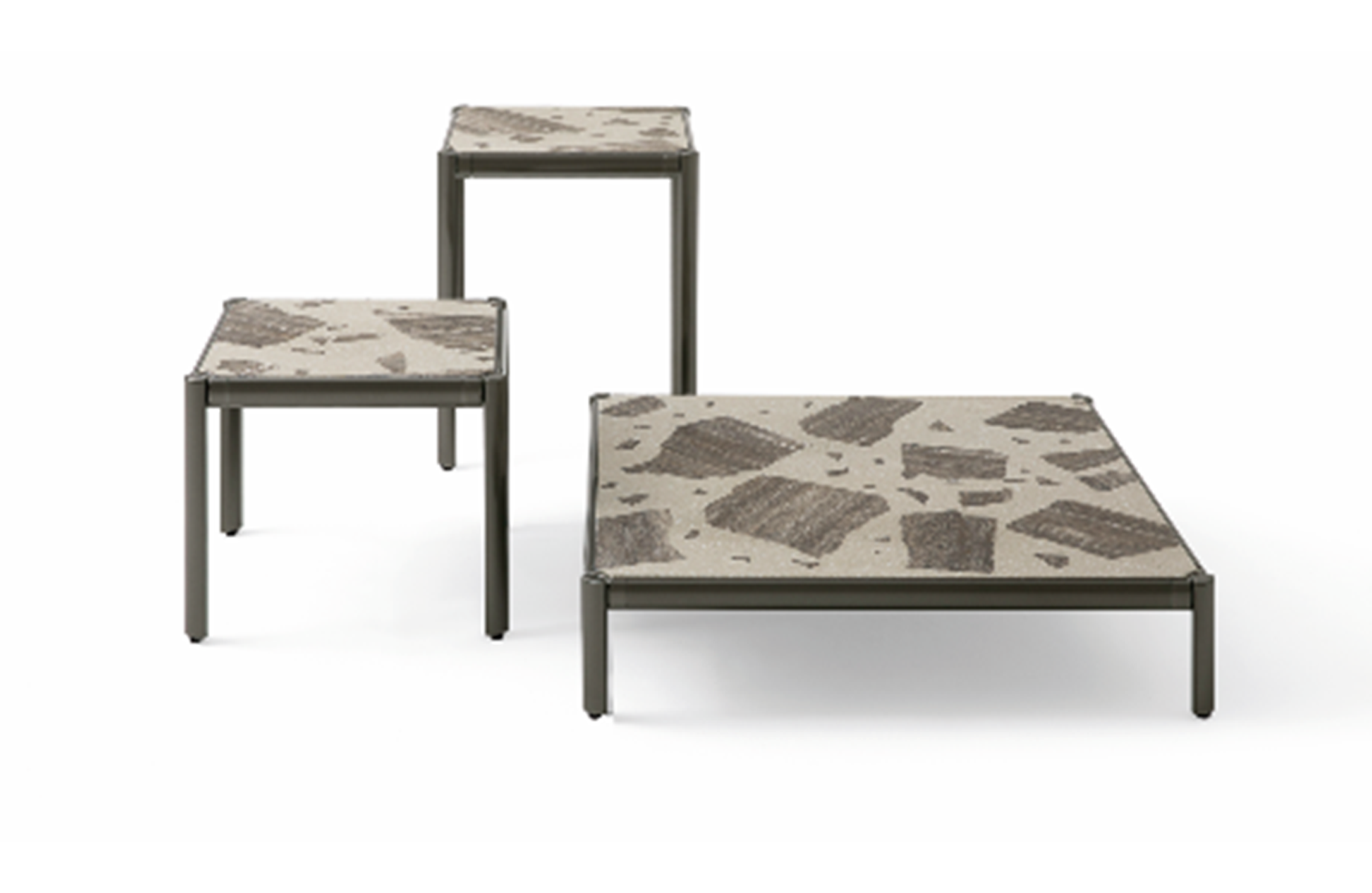 GamFratesiによるアウトドア向けモジュールソファシステム“PATIO”では、マット/光沢仕上げのアルミニウムをフレーム材に採用し、メンテナンス性と耐久性、美しさを実現しました。テーブル部に使用されたマホガニーやブラッシング加工のバサルティーナ(玄武岩)が自然な素材感を加えています。ミラノ市内のショールームに展示されていた同シリーズのブルーグリーンのソファは、屋内でありながら解放感のある空間を演出していました。