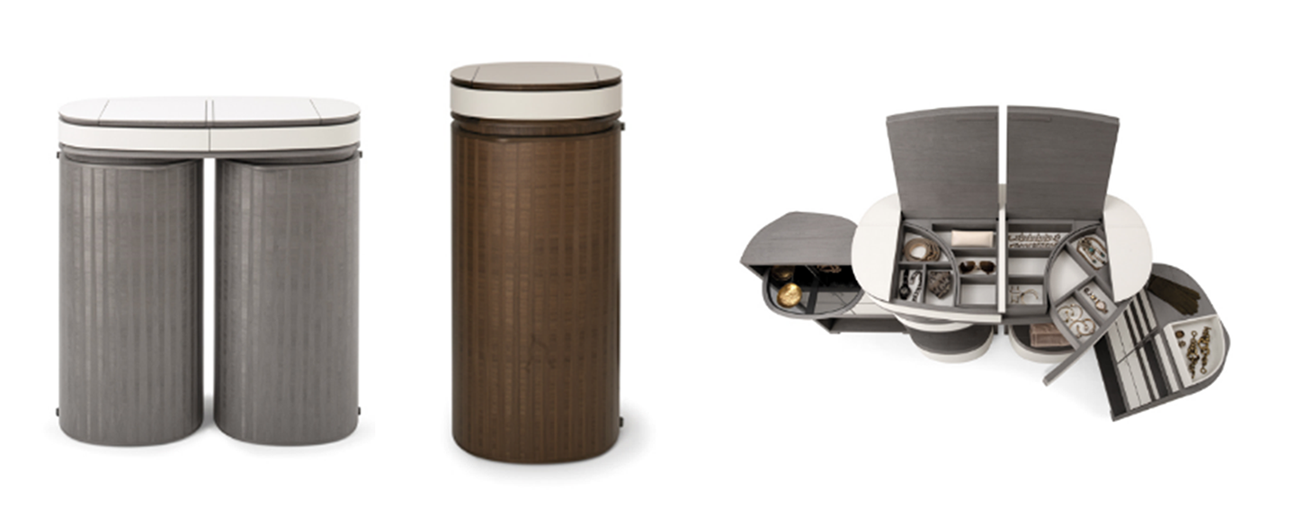円柱状のシンプルな佇まいをしたHOUDINIは、扉を開けるとジュエリーなどさまざまなものが収納できる機能的なキャビネットになっています。サイドボードでも、収納棚でも、バーキャビネットでもなく、神秘的で魔法のような家具を作りたいというRoberto Lazzeroni氏がデザインしました。円柱の形はイタリア ロンバルディアの農村地方で見られる穀物の貯蔵庫「サイロ」からインスパイされ、これはAldo Rossi氏の建築では良く見られる要素です。側面はカナレットウォールナットとメイプルの2種類、上部はレザーで構成されています。円柱が1つ、円柱が2つの2バージョンがあります。