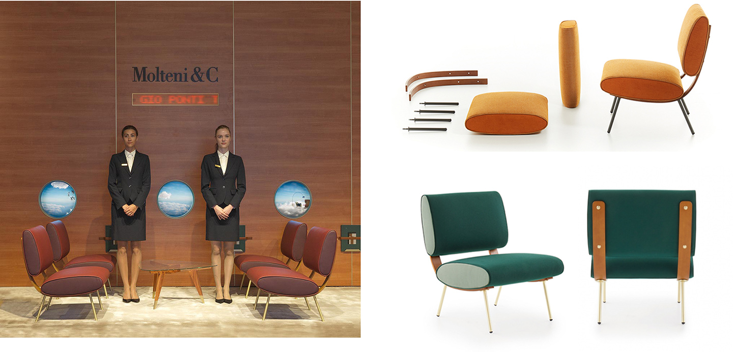 この製品は、Supersaloneの展示会場にて、Ron Gilad氏による航空機内をイメージしたインスタレーションで発表されました。会場内には空港アナウンスが流れ、窓の外には名作家具は空を飛んでいる遊び心のある演出も。これは、当時このチェアがアリタリア航空のラウンジに使用されていたことから着想したものだそうです。