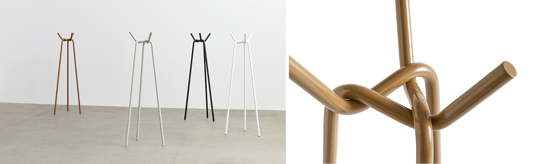 “KNIT”は日本人デザイナー、倉本 仁氏による彫刻的なデザインのコートラックです。「編み物」のように三次元的に交差するラックは、分解した際にフラットパックに収まることが意図されています。また光沢感のあるスチールは、特徴的な編み目を視覚的に際立たせています。マットな質感が主流となる中で、シンプルですが、的確な意図を持った仕上げであると感じます。