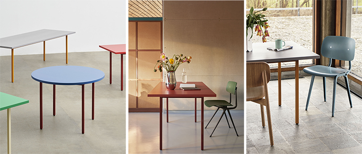 “TWO-COLOUR”は、ベルギーのデザインチーム、 Muller van Severenとのコラボレーションにより生まれました。天板にはFSC認証でもある、バルクロマットMDFを使用しています。バルクロマットは製造工程で有機着色料を含浸させた木質基材です。スチールの脚とのカラーの対比が印象的なこのプロダクトには、HAYの多くの家具に見られる、遊び心と実験的な姿勢が表れています。
