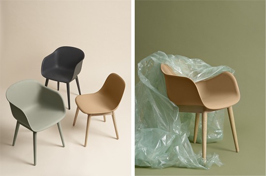 Muutoのエコロジカルな活動は、すでに新商品開発にステージを移しています。2022年の春に北米から発売を予定している、”Fiber Armchair“および”Side Chair”は主原料として、8割のリサイクルプラスチックに2割のバージンプラスチックを配合することで、十分な強度を保ちながら、Muutoならではの色彩を表現しています。また、木部にはFSC認証を受けたオーク材を使用し、プラスチックの製造工程においても100%環境再生エネルギーを使用するなど、徹底したエコロジカルの姿勢がうかがえます。まるで、EV自動車のように、すでにインテリア業界においても環境配慮型の製品は、ポートフォリオの一角を担う段階にあることを示す好例であると言えます。