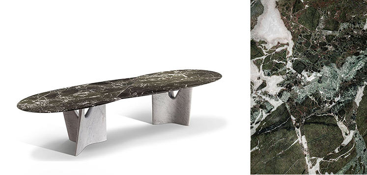 総天然大理石製のテーブル “Infinito∞”。彫刻的な造形のカラカッタマーブルの脚に支えられている天板は、トルコ産のロッソレバントの塊から切り出したものです。本来この大理石は、赤から紫へと移ろう自然なグラデーションの中に白い筋が入った、天然の特徴で知られています。しかし自然界における何か神秘的な出来事が原因となって、石切場の一部から深いセージ色を帯びた一角が発見されました。「無限」を意味する名前の通り、その天板は∞の字の形状を描き、深いセージグリーンをベースにしながら白や赤等のさまざまな要素が織りなす表情はまさに自然の芸術。製造工程の特性から、複製のできない完全限定生産品で、デザインとアート作品の中間に位置するような製品と言えます。