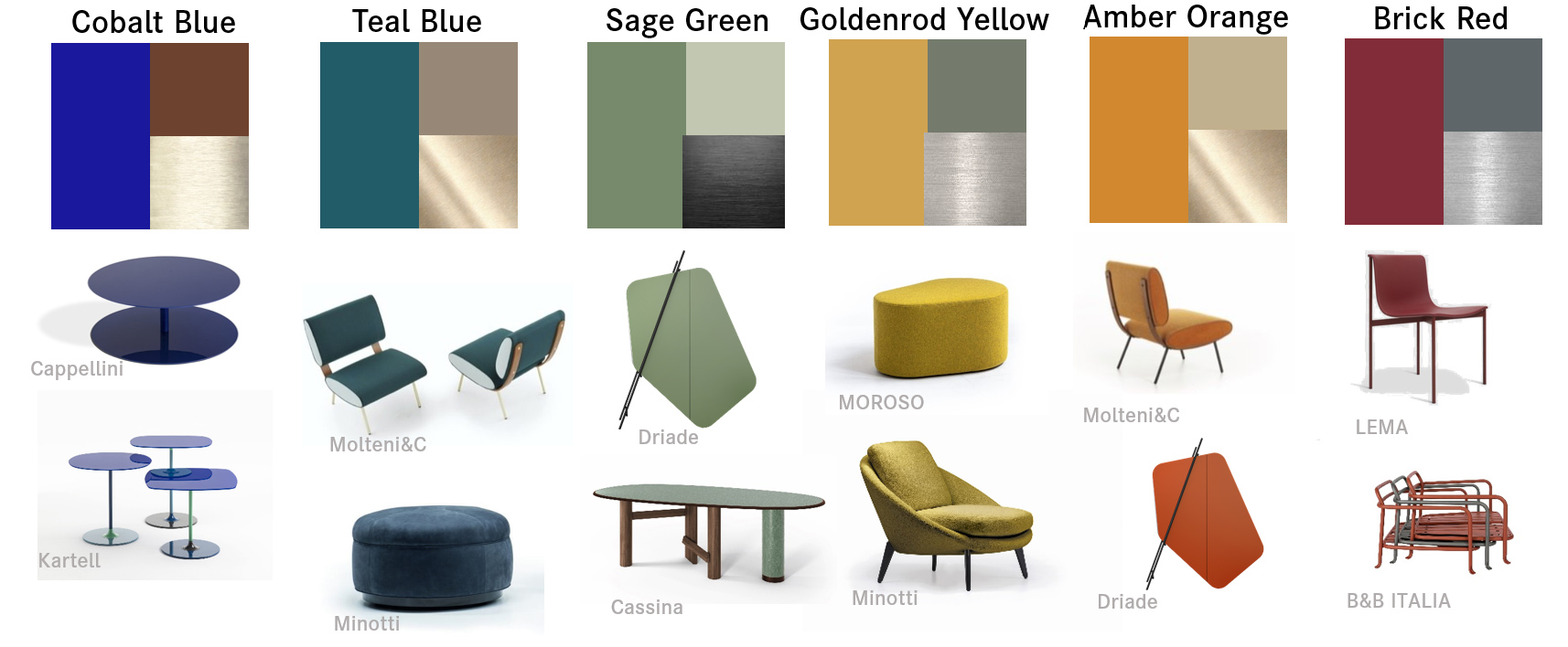 アクセントカラーとして、4つの有彩色カラーと、ブラックとブラウンをトレンドカラーとして選びました。欧州家具アクセントカラーと同様に、自然界をイメージさせるネーミングにしました。有彩色は昨年よりやや彩度の低い方向です。プロダクト単体で見ると、派手な印象ですが、オフホワイト、グレー、ブラウンといったカラーを基調とした空間に、アクセントとして有彩色が1~2色取り入れられ、全体的にクラシカルなテイストやアンティークな雰囲気を感じる、落ち着いた空間をつくりあげています。