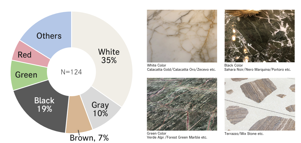 マテリアルの中で、石の素材に関してカラーの割合を示しています。大理石の一番のボリュームゾーンは今年も変わらずホワイトカラーですが、数値はやや減少傾向にあります。またブラック、グレー、ブラウンなどオーソドックスなカラーは減少し、グリーンやレッドのカラー系の大理石が増加しました。