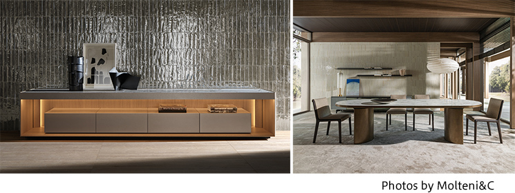 今年の新製品のテーマは「暖かく流動的な家」。そのテーマを象徴する製品のひとつがVincent Van Duysenのデザインによるユニット“LIVING BOX“(左)です。木質材や大理石、金属を巧みに組み合わせたボックス形状をベースとしながら、丸みを帯びたコーナー等のディティール、そして内部に組み込まれたLED照明による家具自体が柔らかく発光する演出が、空間を柔らかく彩ります。また、今年新たに同ブランドのHeritage Collectionに加わったテーブル“BLEVIO“(右)は、Ignazio Gardellaが1930年に自身の実家のためにデザインしたもので、その曲線的なシルエットと異素材の組み合わせが、どこか懐かしさにも似た暖かい雰囲気を創り出しています。