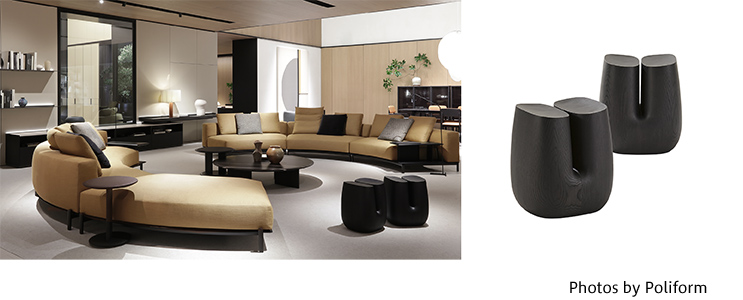 暖かいムードと美しさで包み込まれたPoliformのスタンド空間は、中間色で構成され、優しく穏やかな心地良さを感じました。Jean-Marie Massaudのデザインによる新作ソファBRERAはエレガントな曲線を描き、ココデメールという植物の実からイメージしたスツールUBEが添えられています。そのほか壁材パネルやクローゼットの面材と一体化する建具も発表し、家具だけでなく空間をよりトータルに構成できる提案を行っていました。