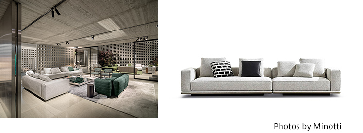 Marcio Kogan/studio mk27によるHORIZONTE。その名の通り水平に伸びるベースラインを軸に、レザーやファブリックによる柔らかなクッションやバックレストを組み合わせていくことで、空間へどこまでも拡張が可能なモジュラーシーティングシステムです。Rho Fiera展示会場では、穴あきコンクリートブロックが内と外の連続性を演出する空間に白とグリーンをベースにコーディネイトされ、Minotti独自のホスピタリティ空間を創り出していました。