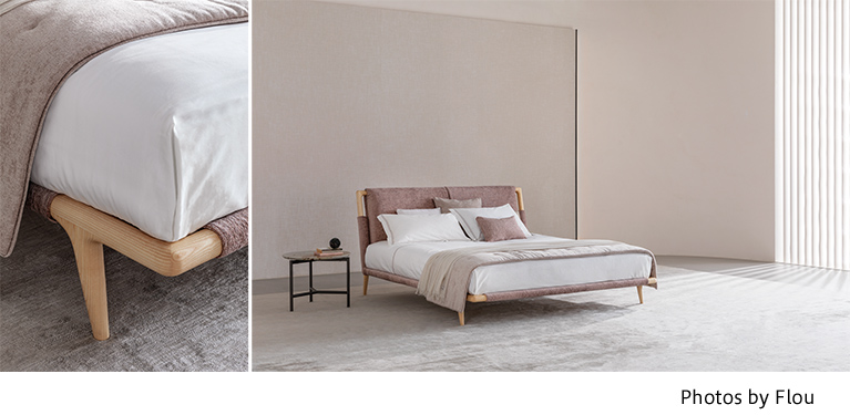 今年のコレクションを“Welcome“というキーワードで表現したFlou。Matteo Nunziatiのデザインによる木のぬくもりをテーマにしたダブルベッドGaudiは今回、フレーム材にナチュラルカラーのアッシュ材を追加。ペールカラーのファブリックとあいまって、人々を優しく迎え入れるような雰囲気を創り出します。