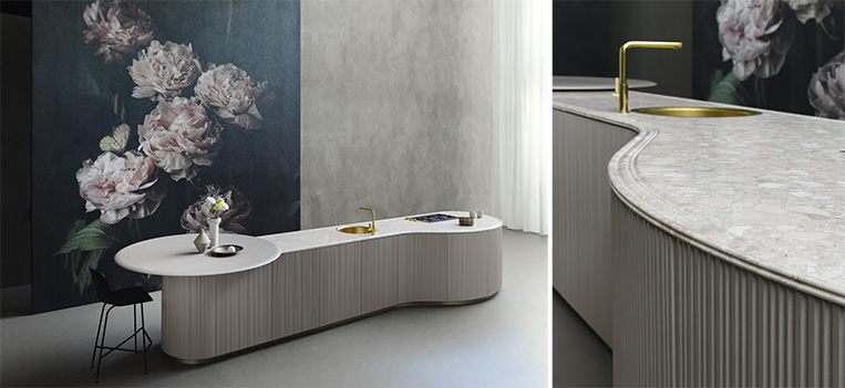 Garcia CuminiによるTANGRAMは、幾何学図形を組み合わせて無限の形を生み出すという中国古代のゲームに着想を受けてデザインされました。キッチンには珍しい5つの曲線が柔らかな印象を演出し、直線との組み合わせによりアイランドやコーナーなどあらゆる形を作ることができます。