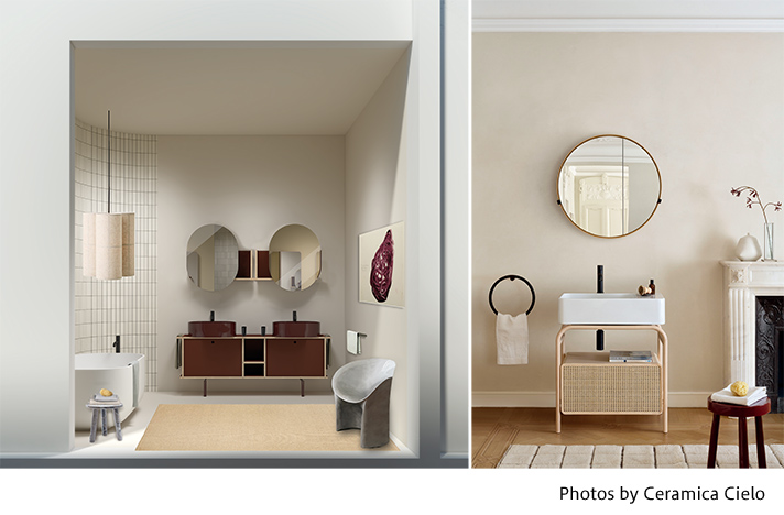 Rho FieraのスタンドはGreta Cevenini のスタイリングで、サニタリースペースの空間提案が行われました。同ブランドが提案するカラーリングやデザインはサニタリーだけでなくリビング空間にも影響を与えています。今年は、明るいトーンにアースカラーが組み合わされ、全体的に清潔感と優しいナチュラルテイストを感じる空間でした。右の画像、Marcelはバウハウスからインスピレーションを受け、Marcel Breuerへのオマージュとしてデザインされました。