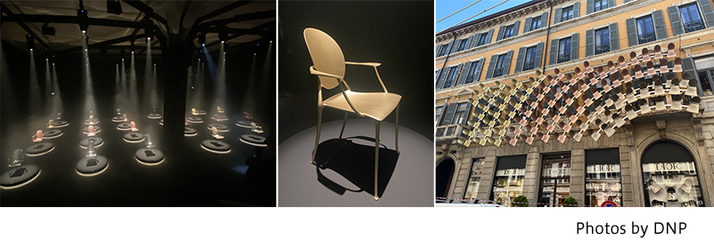DIORは昨年に続き同社のアイコンである「メダリオンチェア」をテーマにした展示を開催。Philippe Starckがシルエットのシンプルを追求して再解釈した「メダリオンチェア」は、大胆なエレガンスを宿した、ある種の女性らしさへのオマージュとして、「ミス ディオール」と名付けられました。展示会場では、メダリオンチェアのシンプルな美しさを際立たせながら、DIORらしいエレガンスさを融合させた音楽と照明の演出で、ひとつの映画を見ているようなうっとりとしてしまう時間が流れていました。またこのチェアはアルミのモノマテリアル製で、リサイクル性、軽量性、強度も優れています。Monte Napoleone通りのショップではそれらをアピールするかのようにブティックのファサードにも「ミス ディオール」チェアが展示されていました。