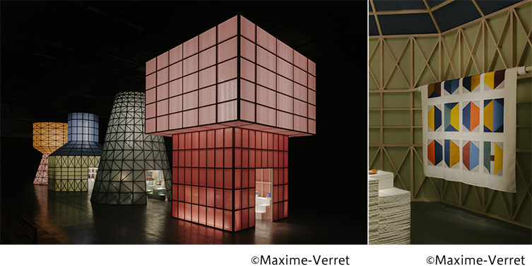 「軽やかさ」をテーマに、木材で給水塔をモチーフにした4つの構造体を製作したエルメス。そこに薄く繊細なカラーペーパーを障子のように張ることで、内部からあふれ出る光が空間を軽やかに包み、行灯のような柔らかい光を放っていました。今年のホームコレクションの新作はカシミアを使ったテキスタイルが主役です。