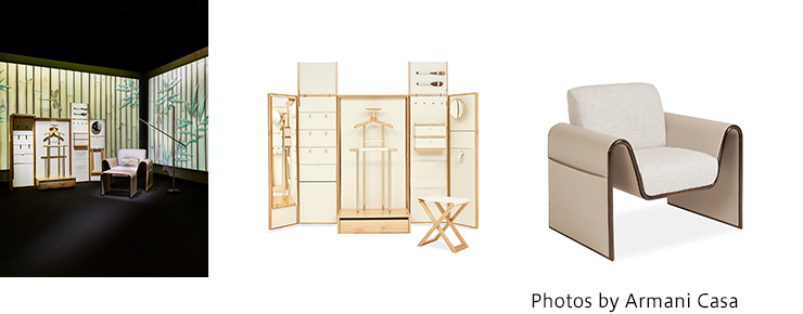 アートギャラリー“Armani Silos”にて、“Water“ “Tigerなど8つのテーマに合わせた映像とともに家具が展示されました。中央の画像は、折り畳み式ドアを備えた小さなワードローブスタンドのSuiteです。扉や側面のストライプ モチーフは、GIORGIO ARMANIファッションのアイコニックなパターンを、イタリア産の桐で表現しています。右の画像は、カナレットウォールナットの輪郭を持つエレガントなSharonチェアです。