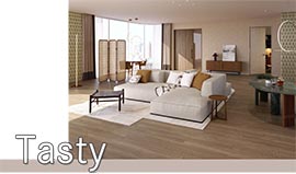 2023年のTastyは「Muted Maturity」をスタイルのテーマにしました。今年のミラノデザインウィークレポートセミナーでもご紹介しましたが、オフホワイト・ベージュ・グレー・ブラウンでまとめられたグレイッシュな空間をDNPではエクレイジュと呼んでいます。ミラノデザインウィーク2023に関するレポートは、こちら(ミラノデザインウィーク2023レポート Vol.4 | コラム・記事 | ソリューション/製品・サービス | DNP 大日本印刷)をご覧ください。そのエクレイジュの中から、全体的に色相をおさえローコントラストでまとめたコーディネートを表現しました。イタリアンモダンらしい高級感のある空間に流動性とダイナミズムも表現しています。 Tastyのペルソナについては、こちら( DNP 5 Styles 2023 | コラム・記事 | ソリューション/製品・サービス | DNP 大日本印刷)をご覧ください。(國東)