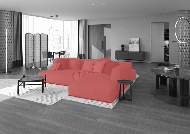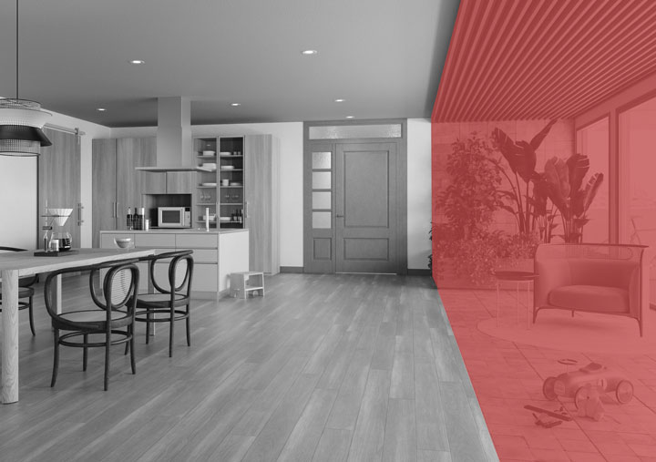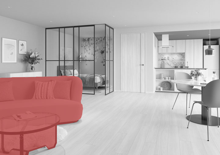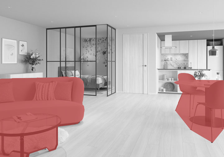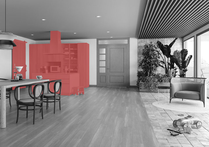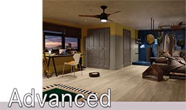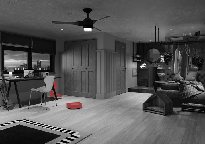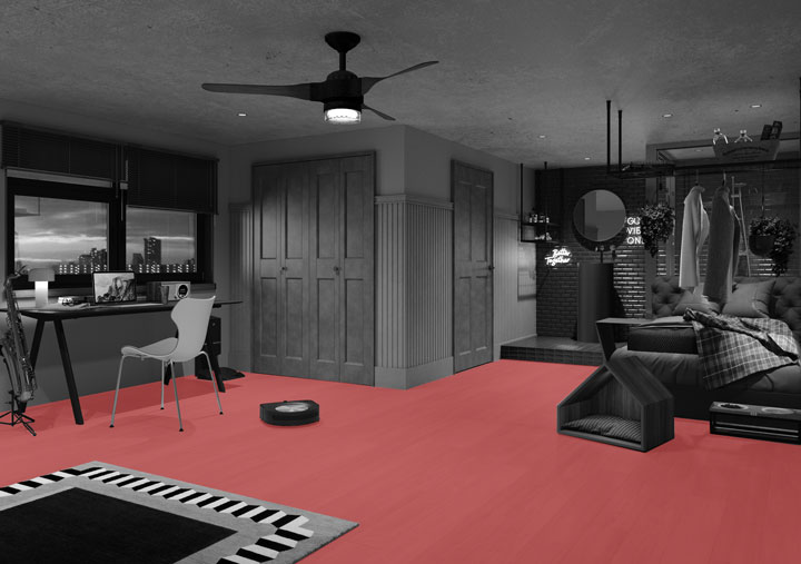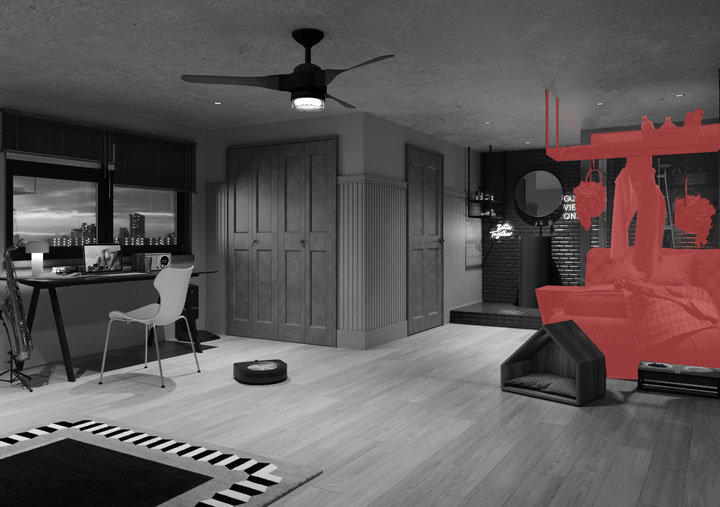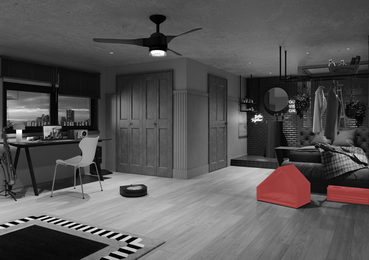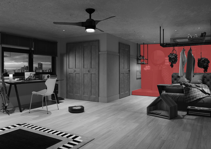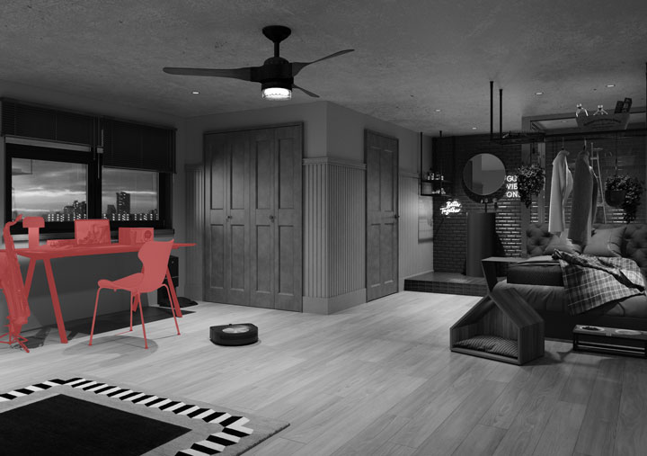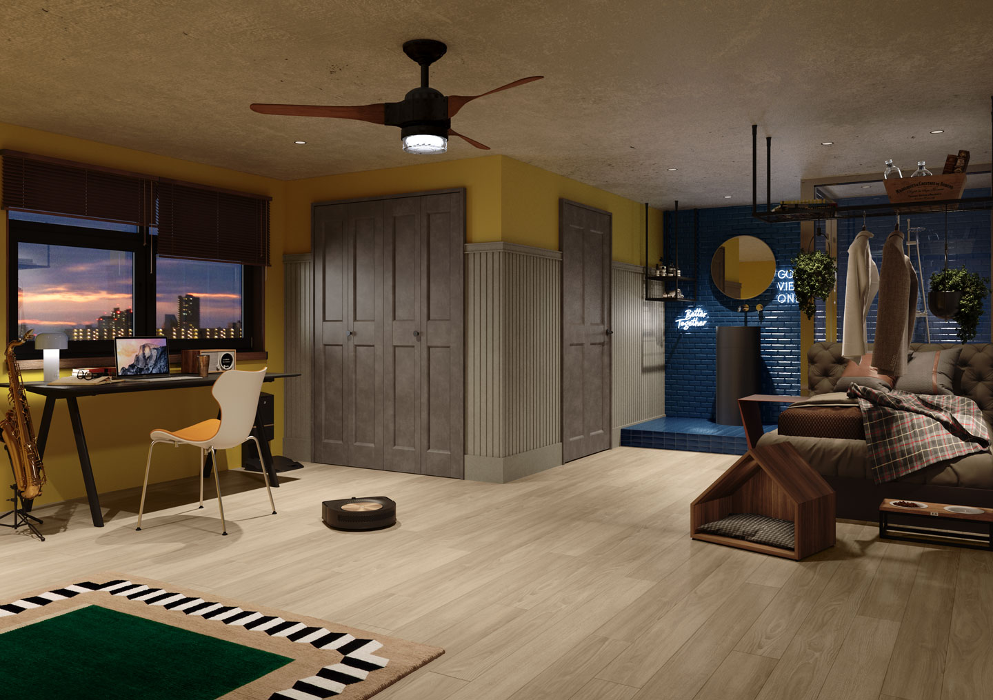 トラディショナルな嗜好と同時に、スマートで便利な暮らしも好むことを表現するために、不在時にお掃除ロボットが掃除をしてくれているシーンをイメージしています。画像は二次元ではありますが、何か動きを感じられる要素を取り入れることで空間がリアルに感じられます。 |