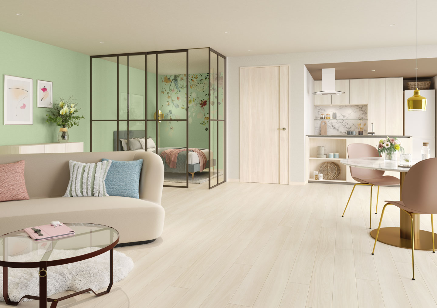 は、建具・造作・収納をはじめ、キッチン・洗面扉などの垂直面にも使用可能なEBオレフィンシートです。