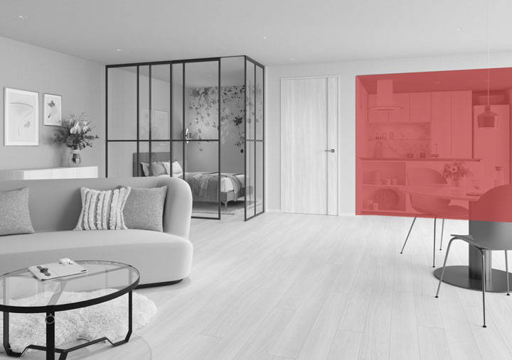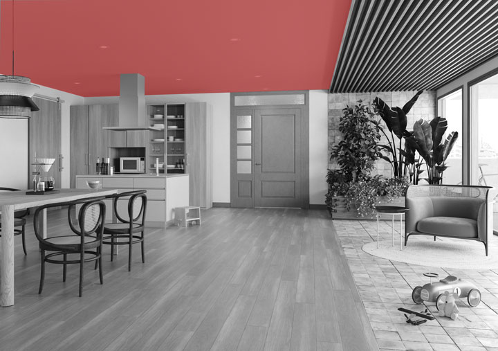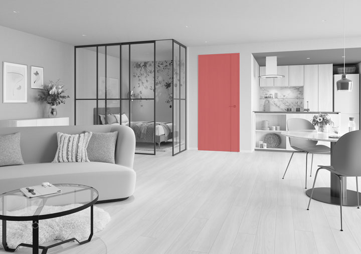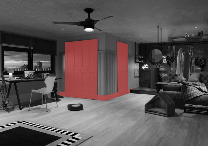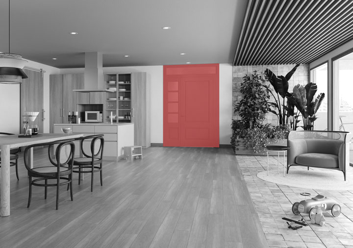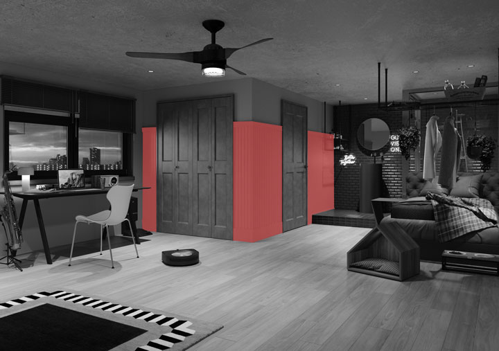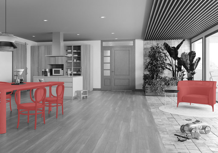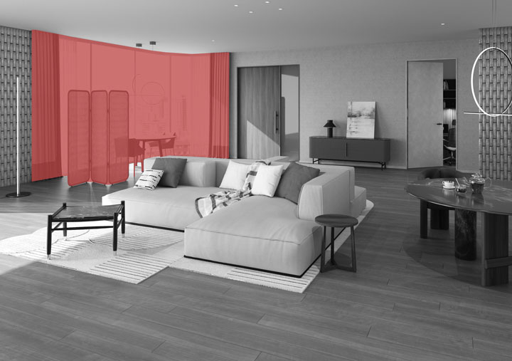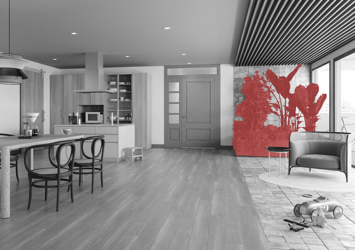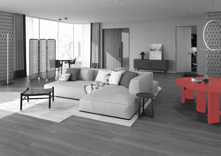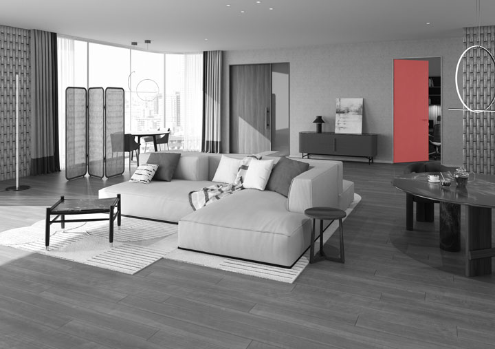 書斎の建具は、LD扉とは異なる意匠を取り入れ、WS-9101E ラスターフィール を選びました。硬質感のあるテクスチャ表現が空間を引き締めます。ここ数年のトレンドである、さまざまなマテリアルを組み合わせ複雑なスタイルをつくりあげるマテリアルミックス空間に一役買っています。また少しだけ扉が開いているような想定をすることで、CGとして空間全体のバランスを整え、空間に奥行き感を与えています。 |