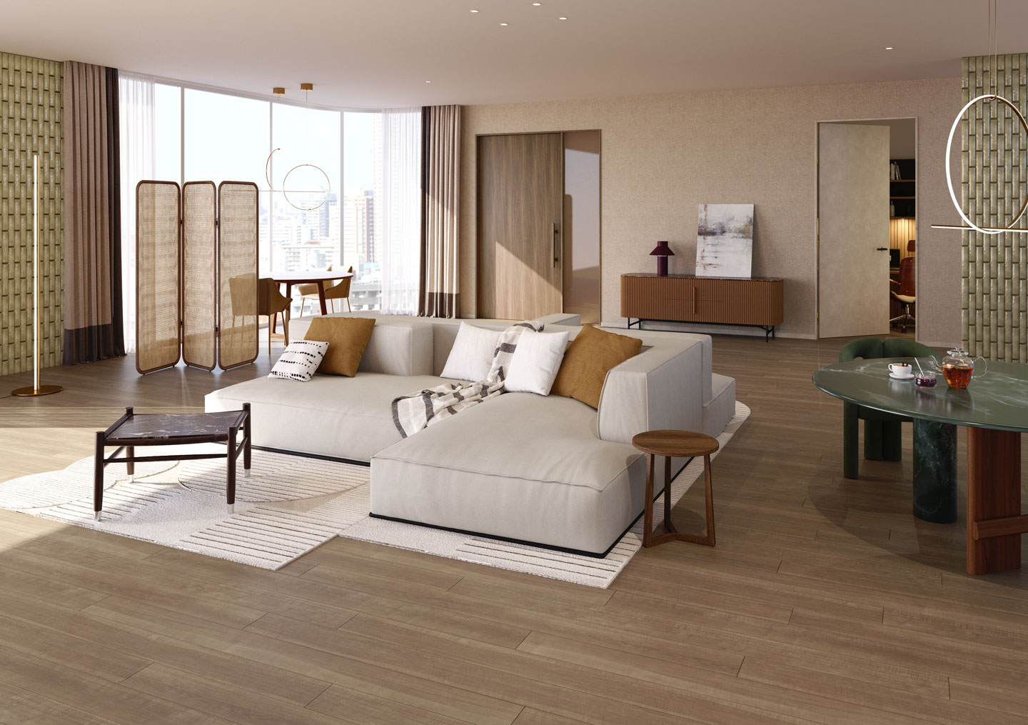 建具のシンプルなデザインは、木質の壁面やラグジュアリーな家具をひきたてます。また垂直面に木質素材が多いため、デザインはシンプルにすることで、スタイリッシュにまとめました。WS-5242E チェリー柄 はペール・ライトカラーの領域の木質柄としてバリエーションを広げてくれる色柄で、細かな色の移り変わりやきらめき感が、爽やかな空間を創造します。 |