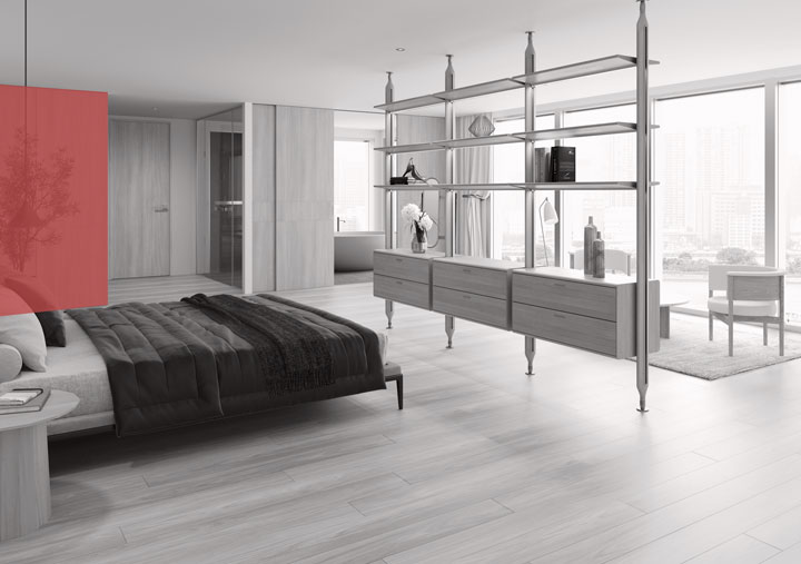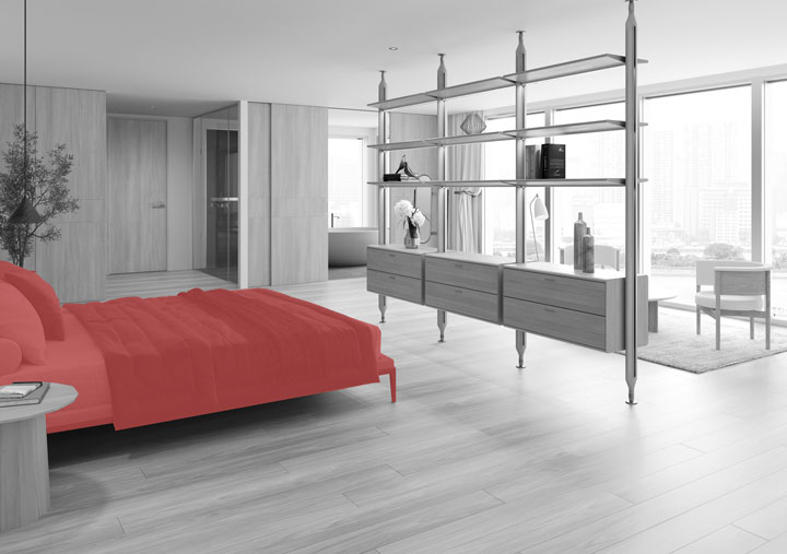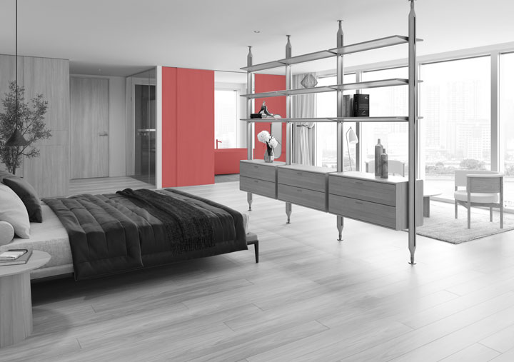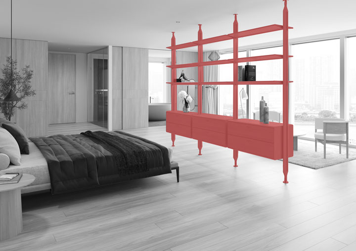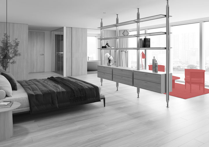 長く続いたステイホームの影響により自宅が多機能になったことで、空間をゆるやかに仕切る収納やパーティションがトレンドになりました。今回はPoliformのLexingtonを採用しました。空間によって好きなユニットを組み合わせることで、閉塞感のないパーティション、そしてお気に入りのものを飾ったり収納できる家具として、非常に多機能なデザインです。 |