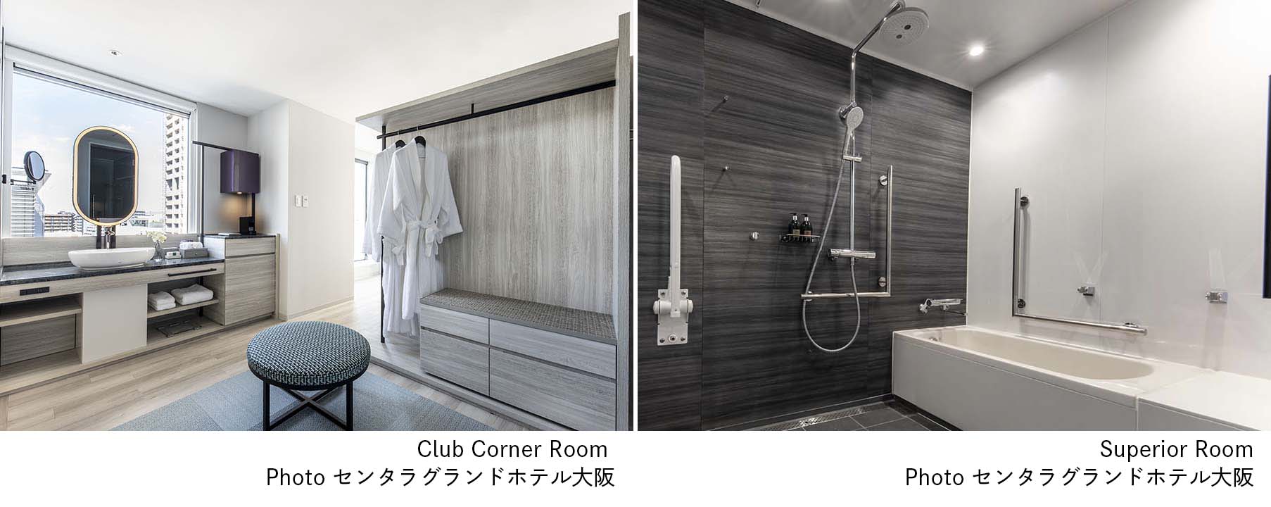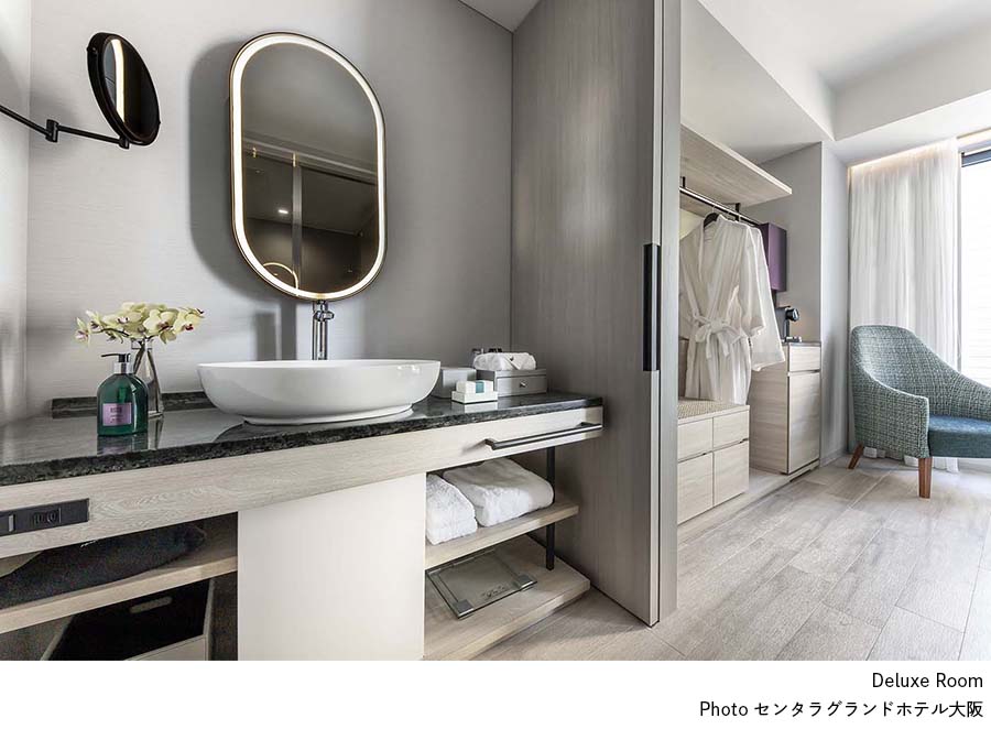 洗面スペースには、バスローブやさまざまなアメニティが用意されており、優雅なバスタイムへと誘います。クラブフロアのバスルームにはバスソルトも用意されています。心身ともにリフレッシュできる時間を提供しています。