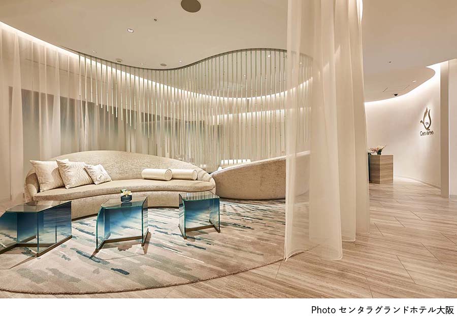 館内には本格的なタイ式トリートメントを体験できるスパ・センバリーもあり、人気を集めています。西洋と東洋のウェルネス哲学を融合させた包括的なセラピーで、心と体、そして精神を整え活性化させます。空間のコンセプトは和菓子。和菓子の中で表現される四季折々の美しさ、透明感や柔らかさを空間で表現しています。柔らかいシアーカーテンがラウンジスペースを包み込み、プライバシーを配慮しつつ、空間の動線を作っています。