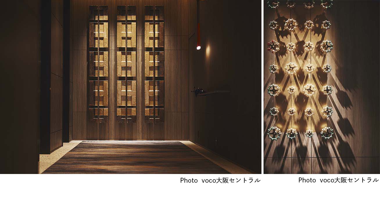 このホテルは、1926年の竣工以来、京町堀を象徴する歴史的建造物として親しまれてきた旧京町ビルの跡地に建設された背景があり、京町ビルに使用されていたレリーフや扉・郵便ポストなどを保存し、インテリアのエッセンスとして取り入れています。左の画像は旧京町ビルで使われていた鉄の扉、右の画像はバルブを活用したアート作品で、「新」「旧」の時代の境目を象徴しています。
