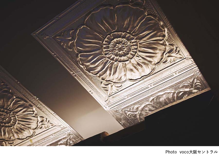 吹き抜けのレストラン天井には、旧京町ビルの外観デザインモチーフとして使われていたレリーフを取り入れています。実際のレリーフパターンを型取り、ブリキ製の化粧パネルで表現しています。