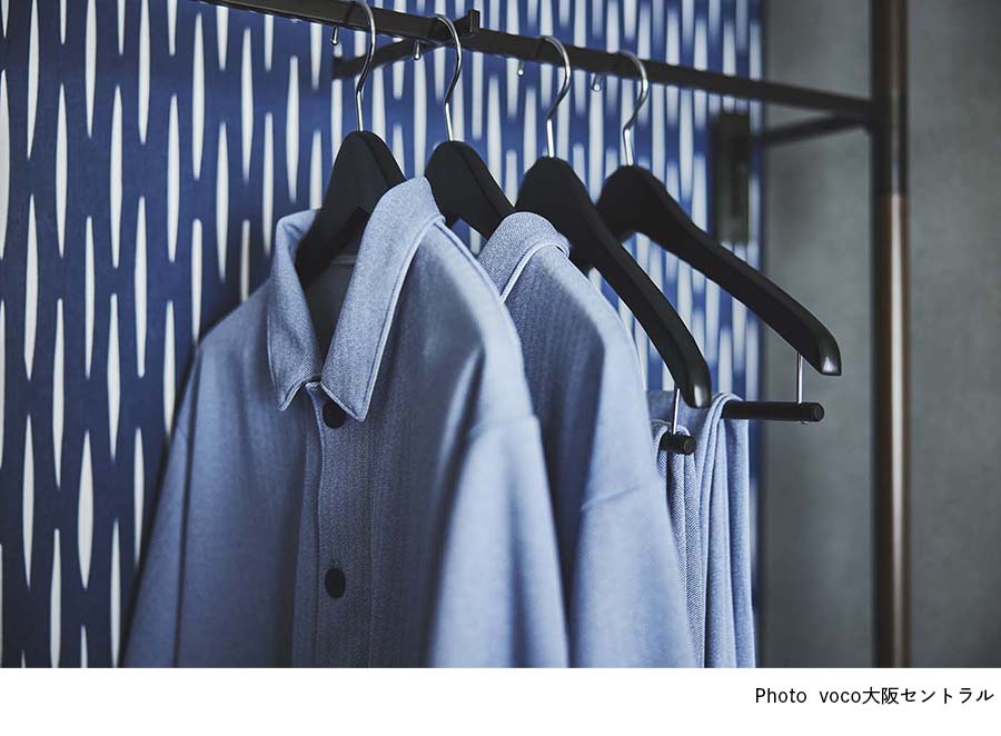 オープンタイプのクローゼットが部屋の開放感を演出し、まるでお気に入りの自宅にいるような感覚を演出します。ネイビーの壁面はややレトロな印象を感じるようなパターンが描かれています。ロビーやレストランの空間で見られた、「新」「旧」の融合というエッセンスを感じました。また引き戸も壁面と同じ意匠が施されており、ノイズレスで空間を広く感じさせています。