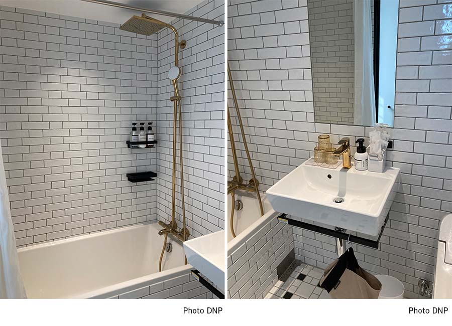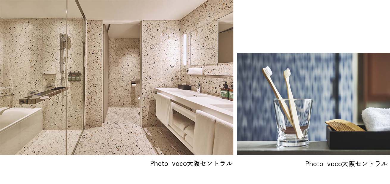 洗面スペース・バスルームは、バーエリアで使用されていたテラゾー素材が床や壁面を構成し、ユニークな空間を作り上げていました。バスルームのシャワーヘッドは気泡が水の消費量を抑えるエアヘッドシャワーを全室に設置。そのほか竹製のアメニティを採用し、成長速度の速い竹の消費の促進や竹林の保護に貢献し、竹製品の魅力も体験できます。
