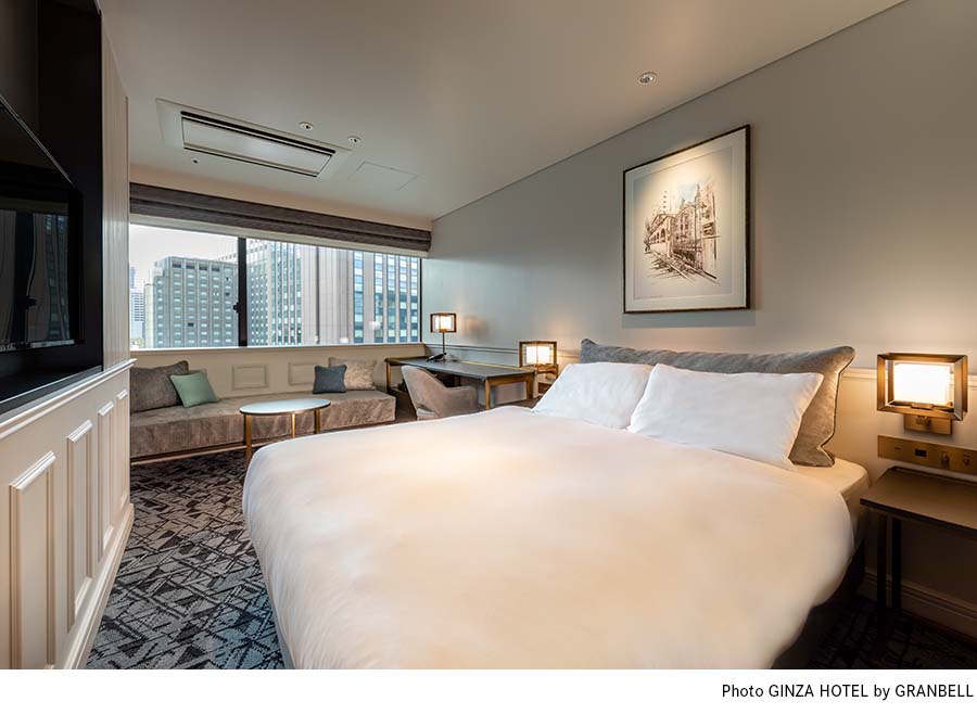 センタラグランドホテル大阪は、タイの文化が持つ華やかさと日本のミニマリズムを融合させた煌びやかで優雅な共有部に対し、客室はグレーを基調にしたスタイリッシュで、静かに落ちける空間をつくっていました。voco大阪セントラルは、大正時代の面影を取り入れつつモダンにまとめた共有部、客室は同じくグレーをベースにしながらもさまざまなカラーやマテリアルが交錯する魅力的な空間でした。国内ではグレイッシュカラーのインテリアがまだまだトレンドとして続いていますが、グレーという中間色の良さを活かし、多様なインテリアスタイルへの展開がみられています。一方でGINZA HOTEL by GRANBELLは銀座らしい高級感の中で、ホワイトをベースにした明るい空間に、ブロンズミラーやゴールドのメタル、上質なファブリックなどさまざまなマテリアルを使い、クラシカルとモダンが融合した空間でした。