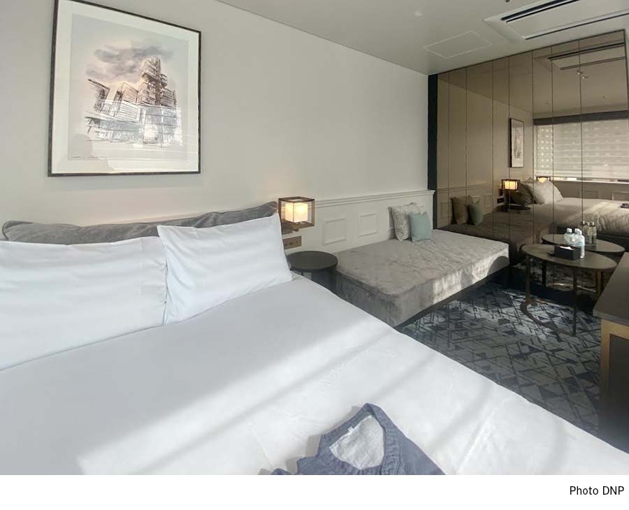 客室はグレー基調のモダンスタイルで、さまざまなマテリアル・カラーをミックスし遊び心を感じる空間です。明るいグレイッシュカラーの木質フロアに対し、客室扉や家具にはダークブラウンの木質を組み合わせ、ハイコントラストのコーディネートになっています。ヘッドボードやサイドテーブル周りは直線のラインが際立つデザインで、3つの球体をもつペンダントライトが空間のアクセントになっています。最高の寝心地を提供するベッドには、環境に配慮したリサイクル素材を枕や布団の中材に使用しています。