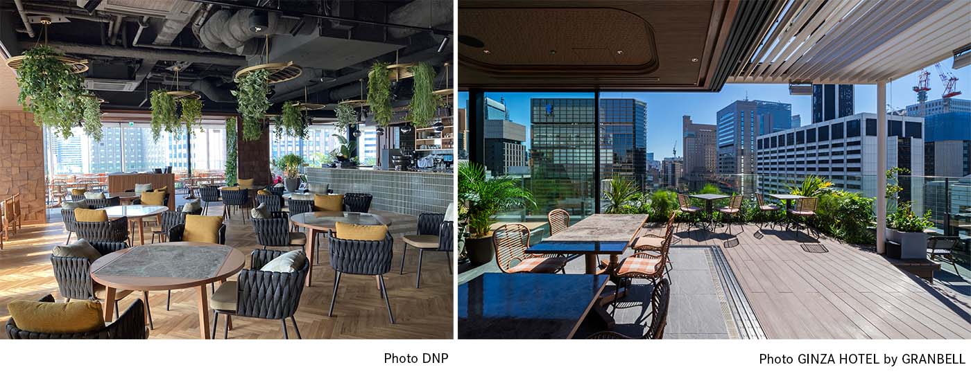10階にあるルーフトップレストランは朝食会場としても使われています。大きな窓ガラスに囲まれた店内は外光が優しく包み込みます。天井からハンギングされた植物、広々としたテラス席が、インテリア空間とエクスエリア空間をシームレスにつないでました。夜はステーキハウス「KIYO GINZA」としてオープンしています。