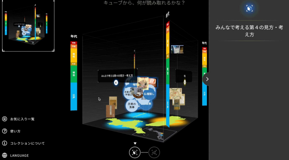 当初、「みどころキューブ」はミュージアム向けの鑑賞システムとして、資料や作品などのコレクションのデジタルデータを魅力的に表現する目的で開発されました。ところが、そのインタフェース上の特長から、子どもたちの学習に対する問いを誘発し、さまざまな資料・情報を活用した主体的な調べ学習を促し、継続的な探究学習を実現する補助教材としての可能性も期待されています。