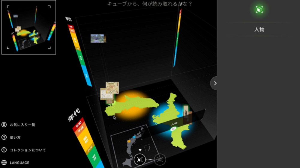 「みどころキューブ」は、独自のキューブ(立方体)状のインタフェース※に資料の情報を立体的に配置し、それらの複雑な関係性を視覚的にわかりやすく表現することができる新しいビューアです。インタラクティブな操作で資料との”偶然の出会い”を創出するためのさまざまな機能を有しています。