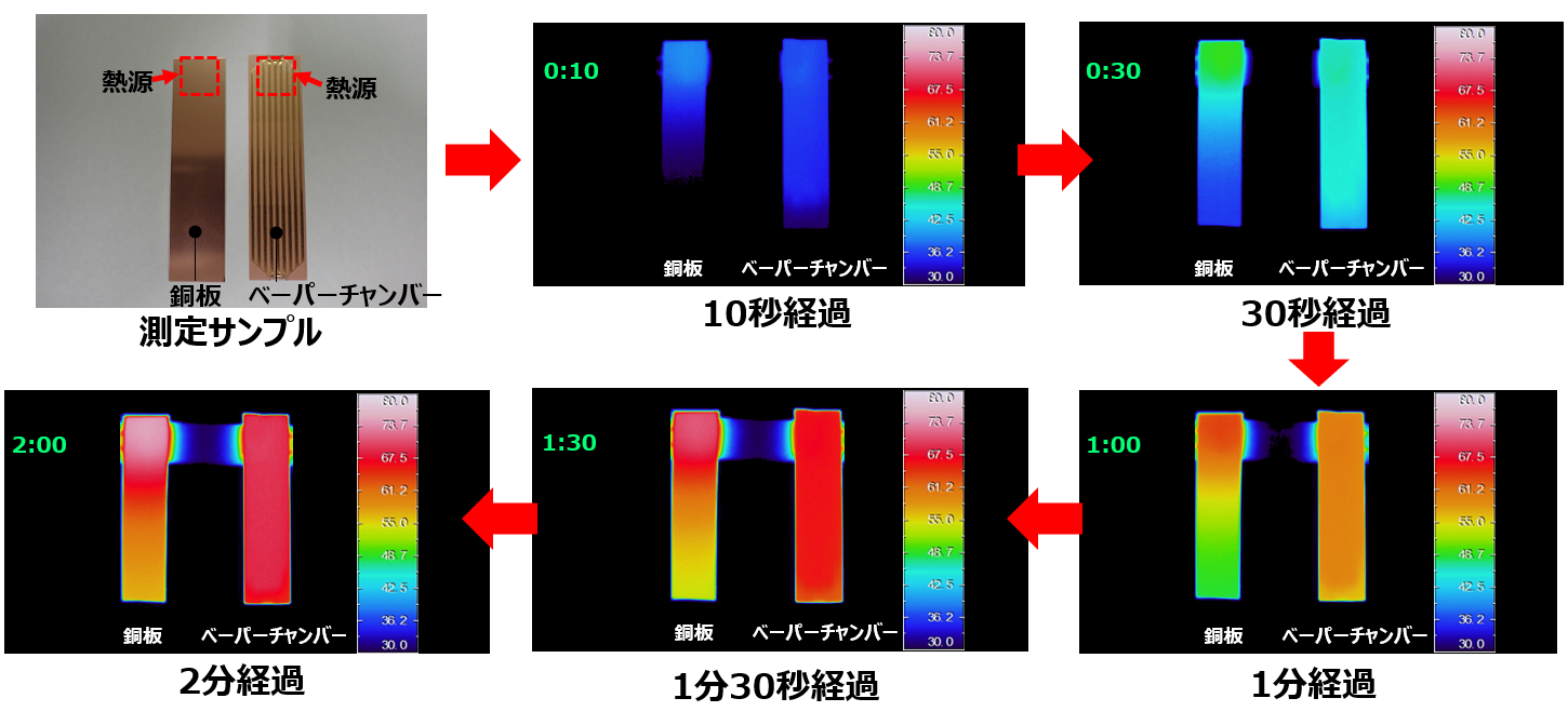 ベイパーチャンバーと銅板の、熱の伝わり方の比較