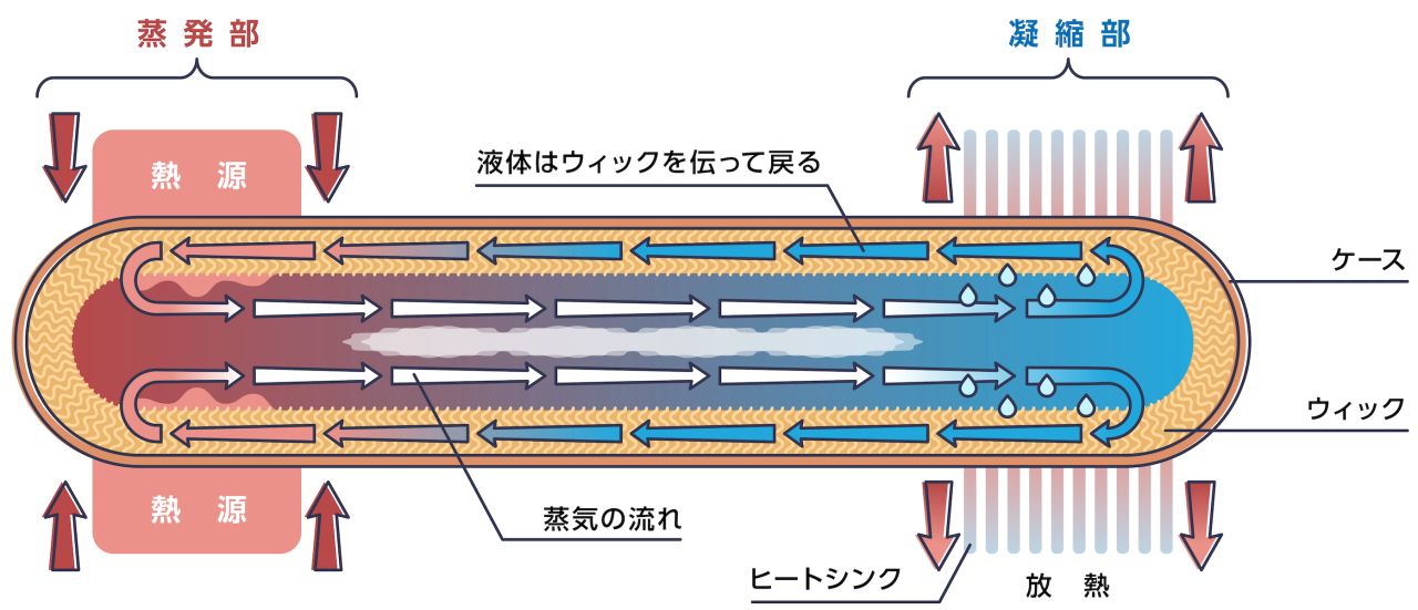 ヒートパイプは、銅やアルミなど熱伝導率が高い金属などで作ったパイプの中に、作動液と呼ぶ少量の液体(純水など)が密封されたもので、パイプの内側には毛細管構造(ウィック)が作られています。パイプの中は、作動液とその蒸気以外が含まれないよう真空状態になっており、作動液の蒸発・凝縮が起きやすくなっています。