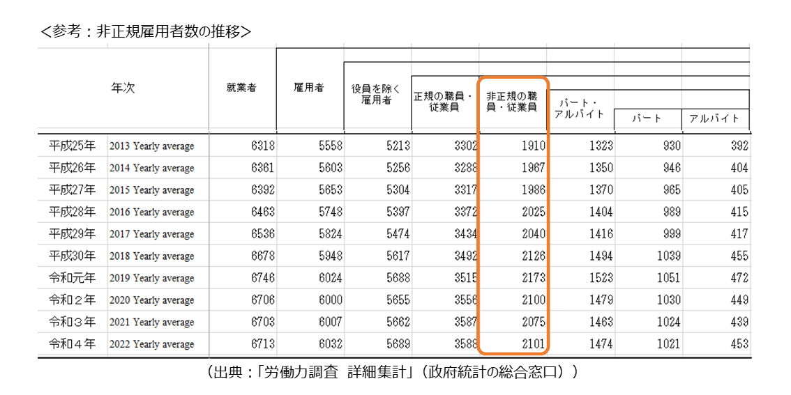 働き方の多様化が推進され、パート・アルバイトなど非正規従業員数は年々増えています。非正規の職員・従業員は2,101万人と7年連続で2,000万人を超えている状況です(出典:「労働力調査結果」(総務省統計局))。これは、役員を除いた従業員の約37%となっており、およそ5人に2人は非正規従業員という計算になります。