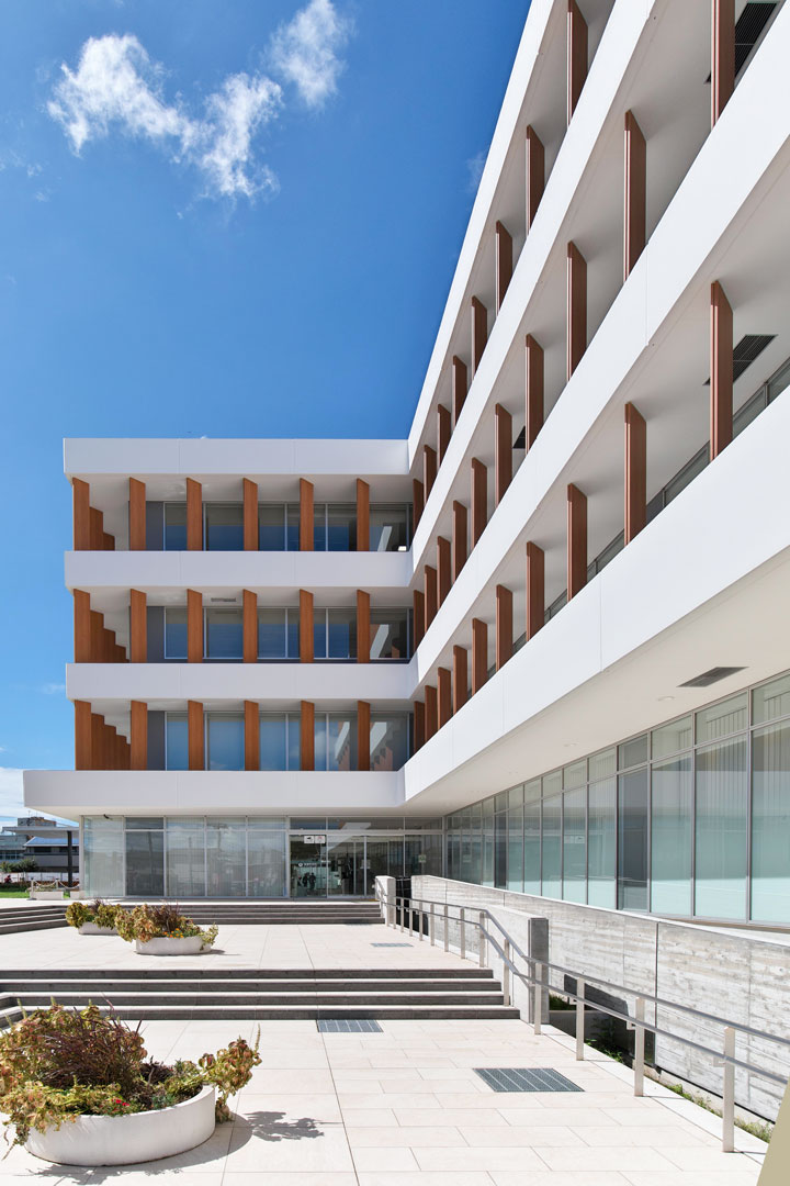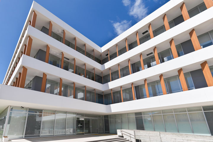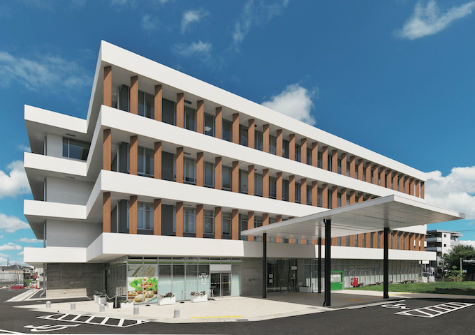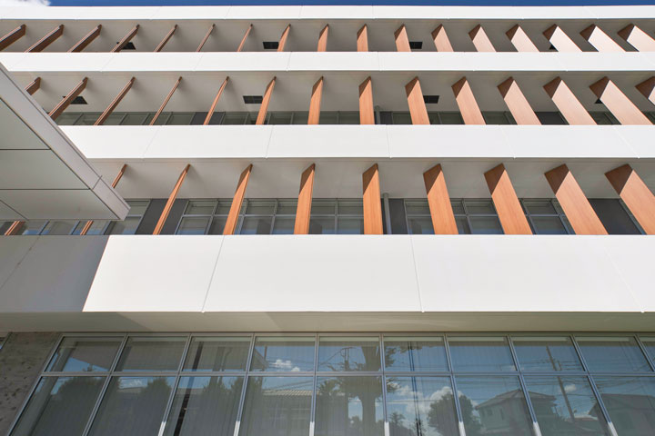 地上4階建ての建物は細長く、各階に設けられた帯のような庇によって水平ラインが強調されたモダンな外観が印象的です。白い庇の奥行は深く、シンプルでありながら彫りの深い表情をしています。そして、2〜4階の庇の間で等間隔に並ぶ茶色の縦ルーバーによって、リズムのある特徴的なファサードが生み出されています。