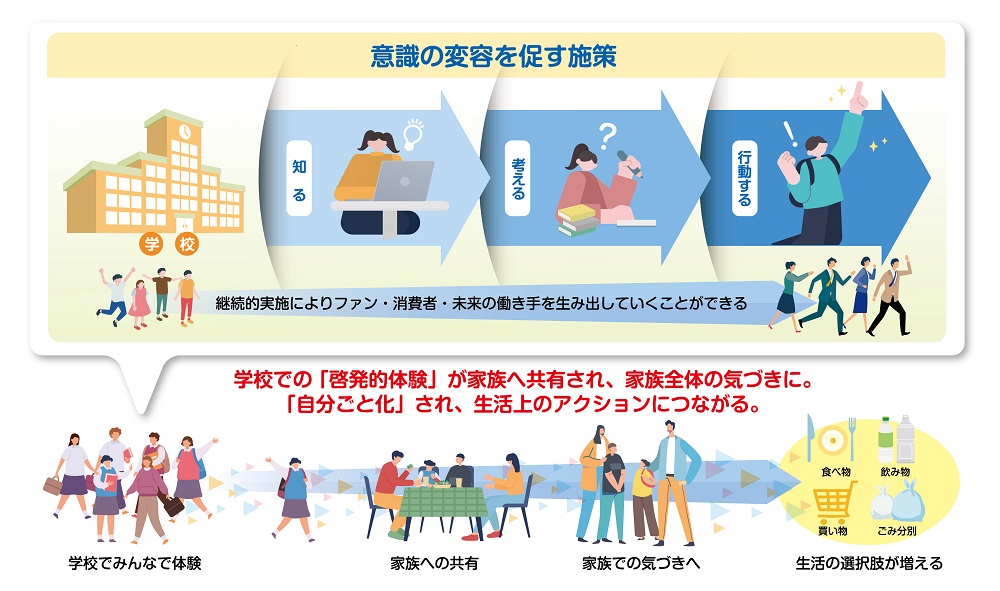 学校での学びは、家庭における行動・習慣化つながります。消費行動の中心となる母親や父親へのマーケティングにも波及していきます。