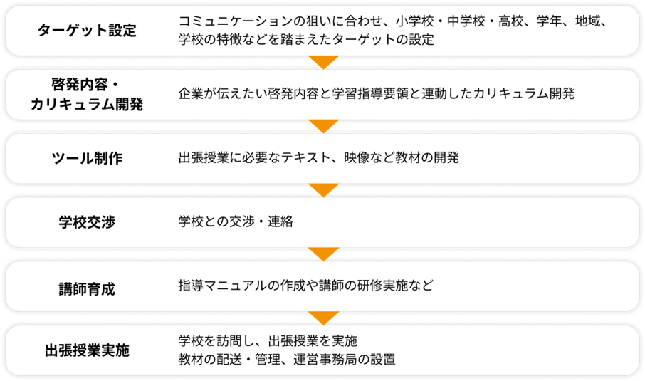 以下に一般的なプロセスをご紹介します。訴求したい内容と効果に合わせ、ターゲット年齢、地域などから、どんな学校で出張授業を実施するかを検討します。啓発する内容をカリキュラムとしてまとめ、概要がまとまったところで、各学校への交渉を開始します。