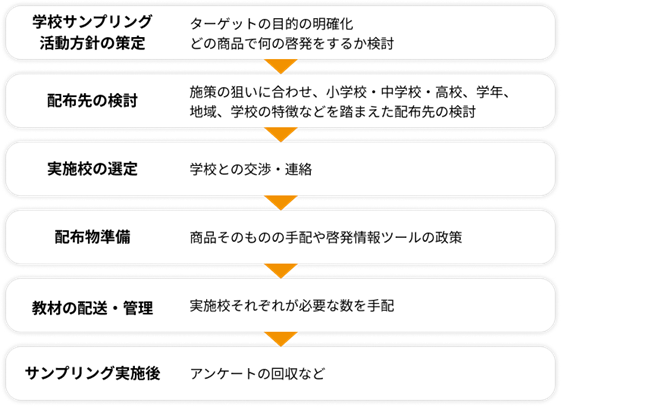 充実した配布先ネットワークを持ち、学校サンプリングの経験豊富なパートナー企業に依頼することが最も効率的、かつ有効な手段です。