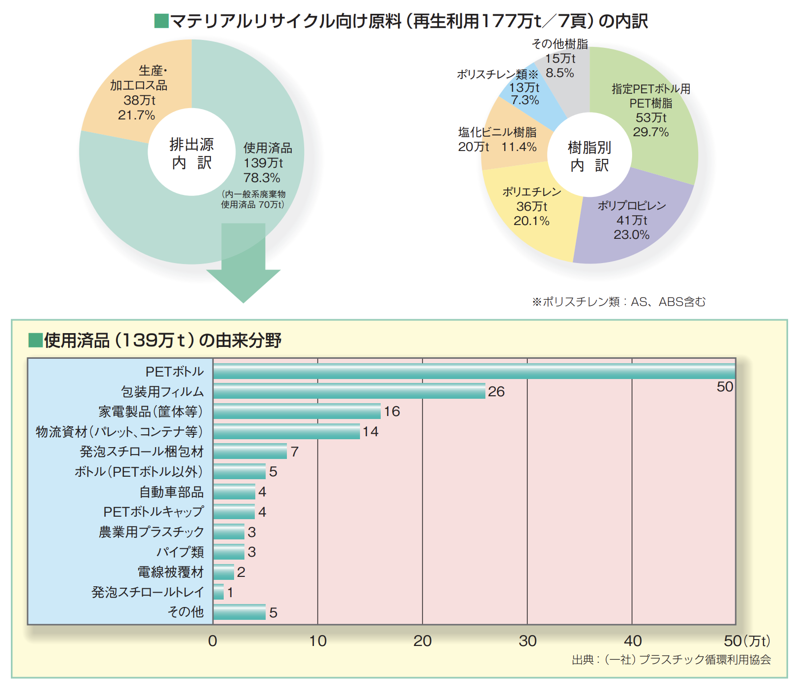 プラスチック廃棄物の内、マテリアルリサイクルに使用される使用済品の由来内訳(2021年実績)(引用) |