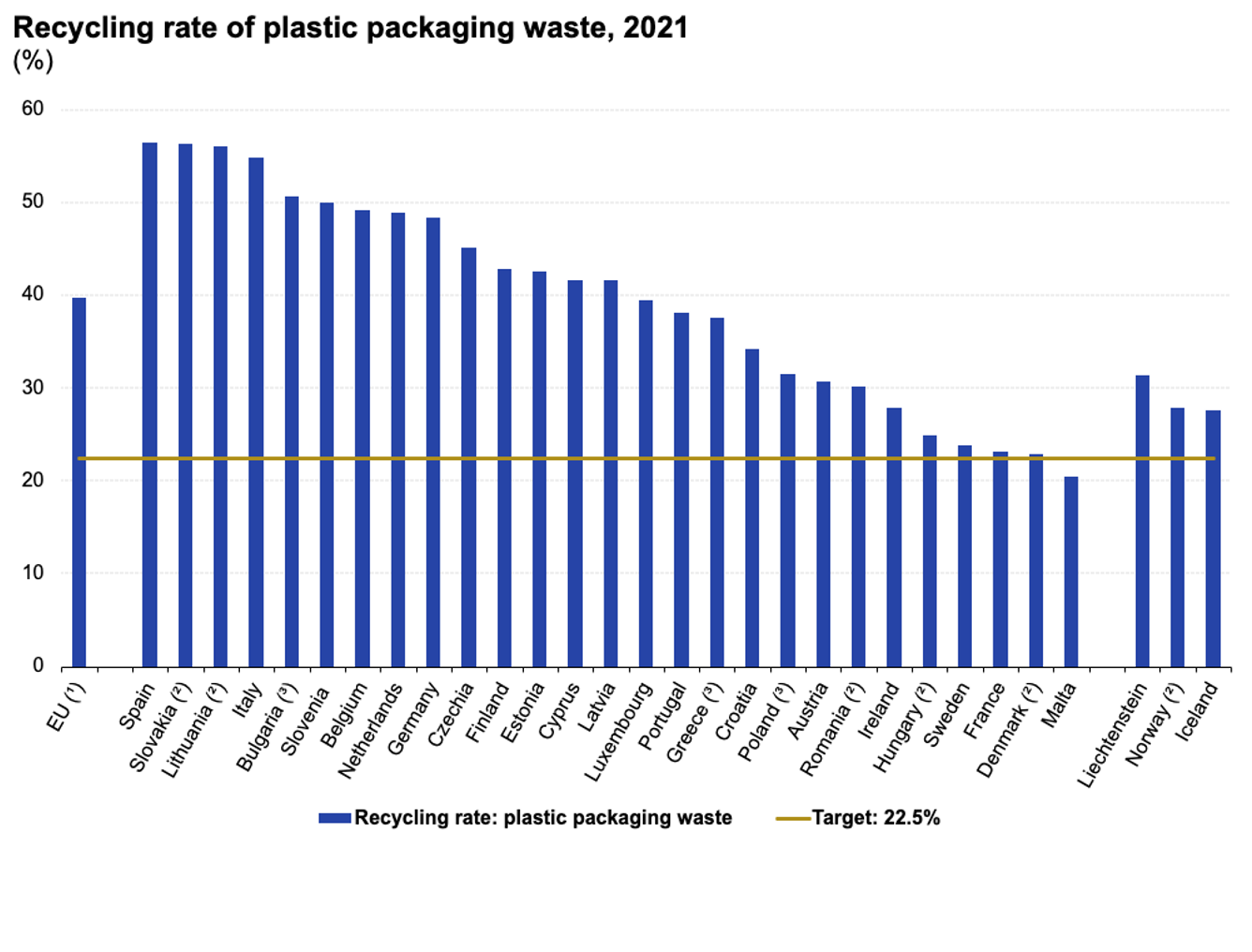 EU加盟国は、プラスチック廃棄物を原材料レベルに戻して再生利用をする「マテリアルリサイクル」に積極的に取り組んでいます。EU推計(ユーロスタット、2021年)によると、プラスチック包装廃棄物のマテリアルリサイクル率は39.7%(EU27カ国平均)です。最高はスペインの56.4%、最低はマルタの20.5%です。EUのマテリアルリサイクル目標22.5%を達成している国は、27カ国中26カ国であり全体の96%となっています。