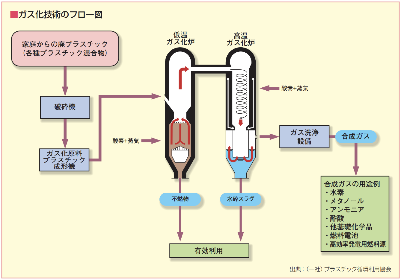 低温ガス化炉では600~800℃に熱し、プラスチック廃棄物を一酸化炭素、水素、炭化水素、チャー(炭化固形物)に分解します。次の高温ガス化炉では、低温ガス化炉から排出されたガスを1300~1500℃に熱して、酸素および蒸気と反応させて一酸化炭素と水素主体の合成ガスに変えます。