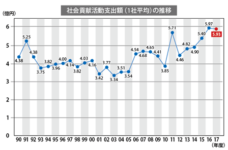 経団連の調査によると、CSRの社会貢献活動への1社平均の支出額は増加傾向にあります(図1)。