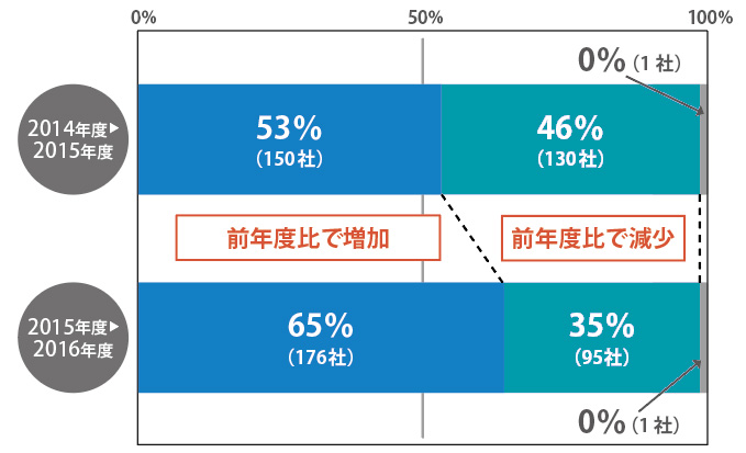 また、2015年度・2016年度に連続して回答した企業の動向を見ると、支出額を増やした企業がおよそ3分の2にのぼります。2014年度から2015年度にかけて支出額を増やした企業が半数だったことと比較すると、企業の一般的な傾向として社会貢献支出を増やしているといえます(図2)。