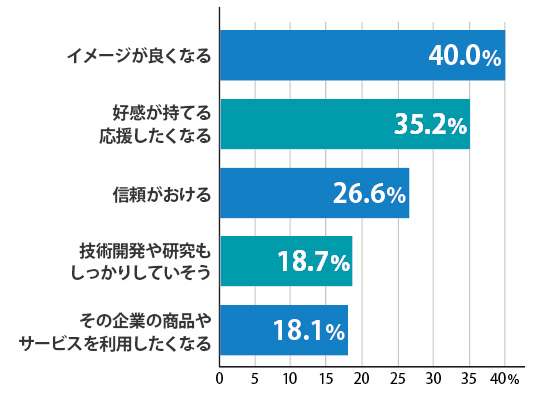 電通の生活者調査によると、積極的にSDGsに取り組む企業に対しては「イメージが良くなる(40.0%)」「好感が持てる/応援したくなる(35.2%)」「信頼がおける(26.6%)」などと評価が高いことがわかりました(図4)。