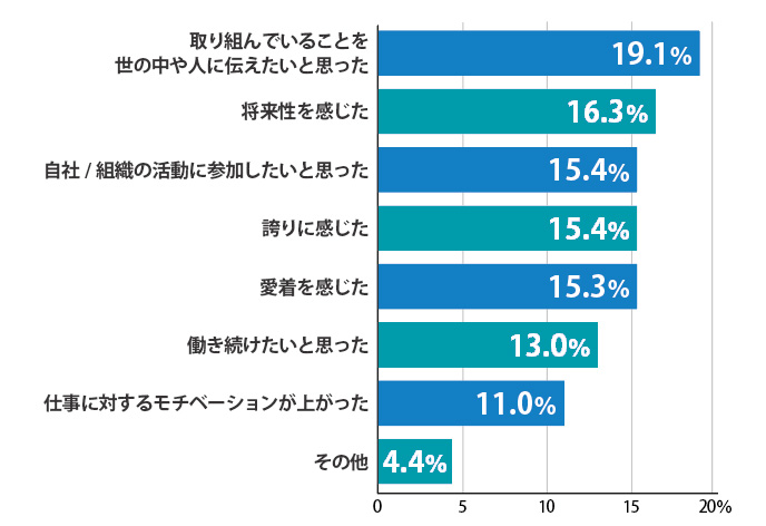 なかでも、30代男性では「誇りに感じた(21.7%)」、「働き続けたいと思った(21.1%)」「仕事に対するモチベーションがあがった(20.7%)」などの割合が高くなります(図5、6)。